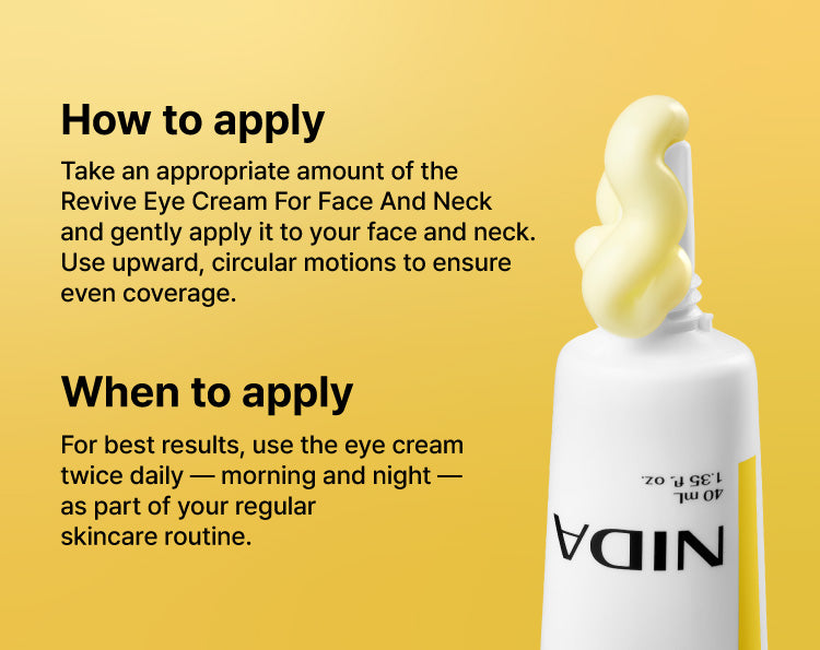 Apply small amount of cream to your eye(face) and neck. Gently massage until absorbed. For best results, use after applying NIDA ultimate moisturizing cream.