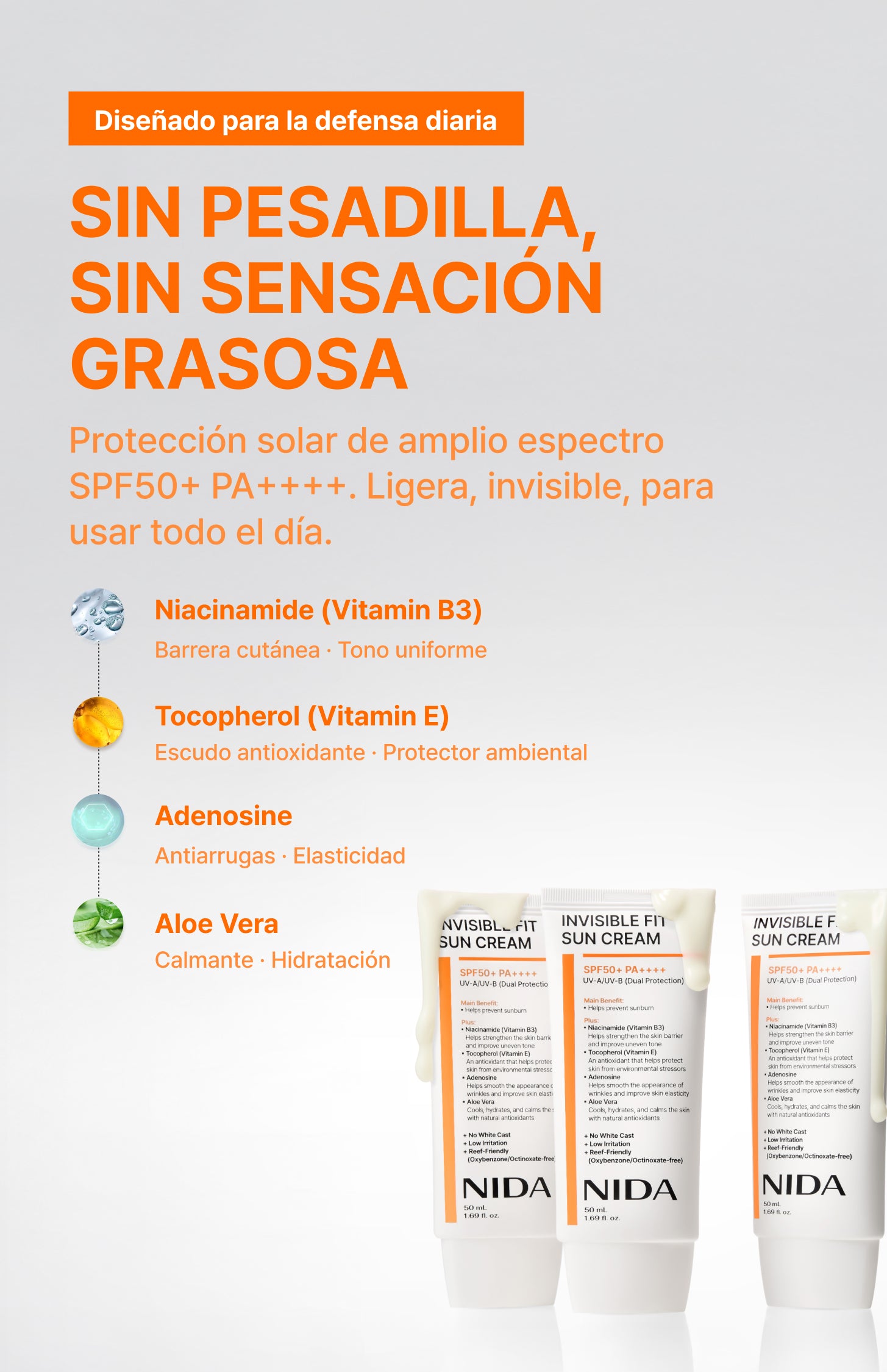 Unlike heavy, chalky sunscreens that leave you looking ghost-like, our Invisible Fit formula gives you serious SPF50+ PA++++ dual protection that disappears into your skin. No white residue. No greasy feeling. Just invisible protection.