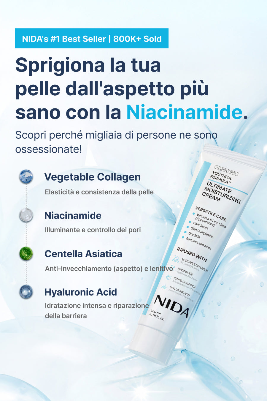 L'acido ialuronico idrata in profondità e trattiene l'umidità, lasciando la pelle morbida, elastica e fresca.