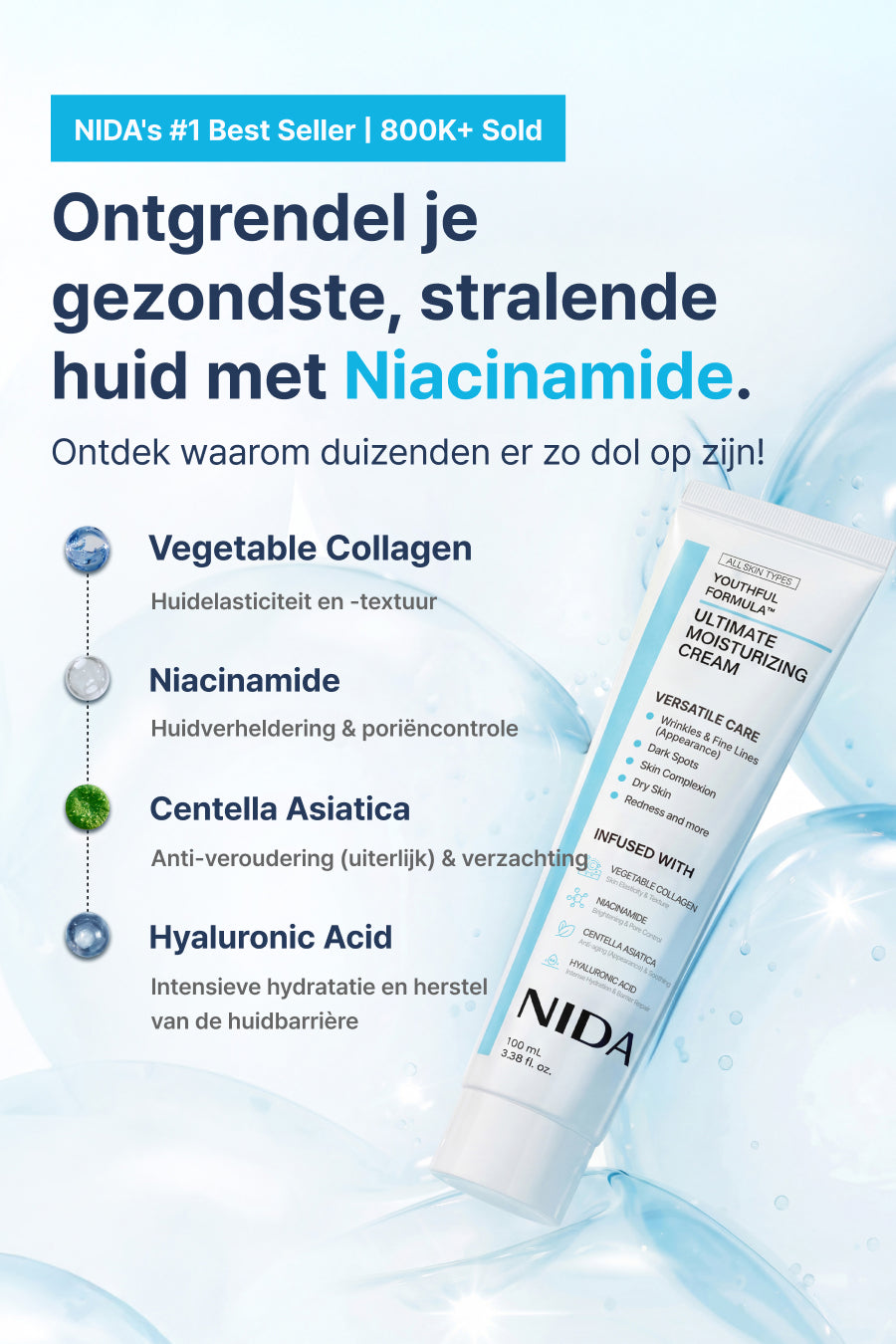 Niacinamide verheldert doffe plekken en helpt donkere vlekken te vervagen voor een egalere, stralende teint.