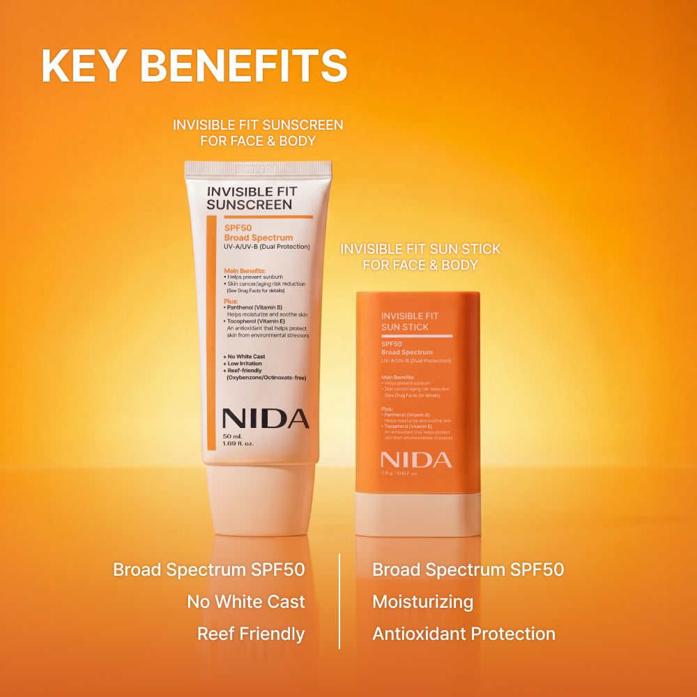 🧴 Invisible Fit Sunscreen (50ml): SPF50 Broad Spectrum, No White Cast, Low Irritation, Reef-Friendly — ideal for daily full-face coverage. 🪄 Invisible Fit Sun Stick (19g): SPF50 Broad Spectrum, Moisturizing & Soothing, Antioxidant Protection — perfect for on-the-go touch-ups.