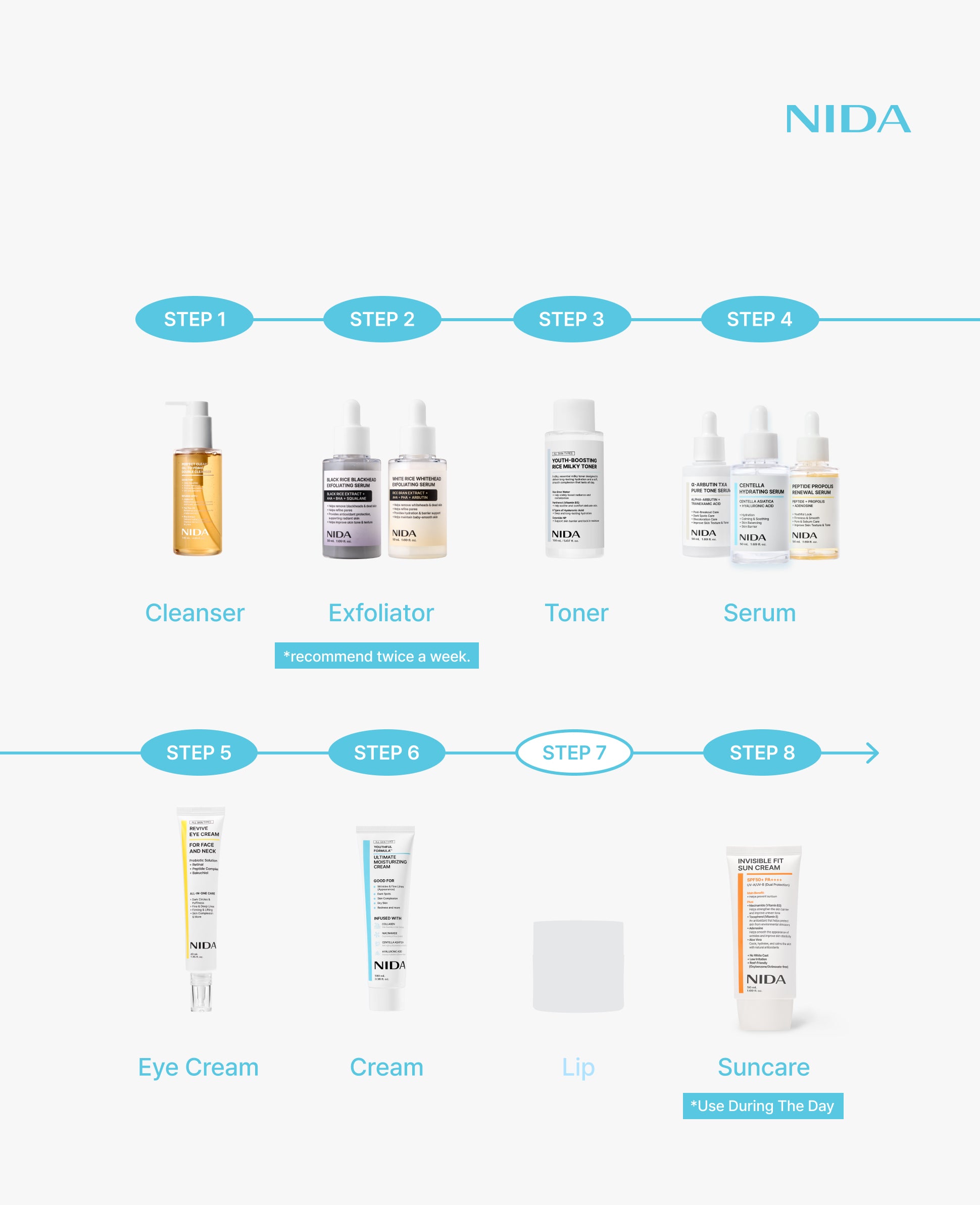 • 3️⃣ NIDA White Rice Exfoliating Serum